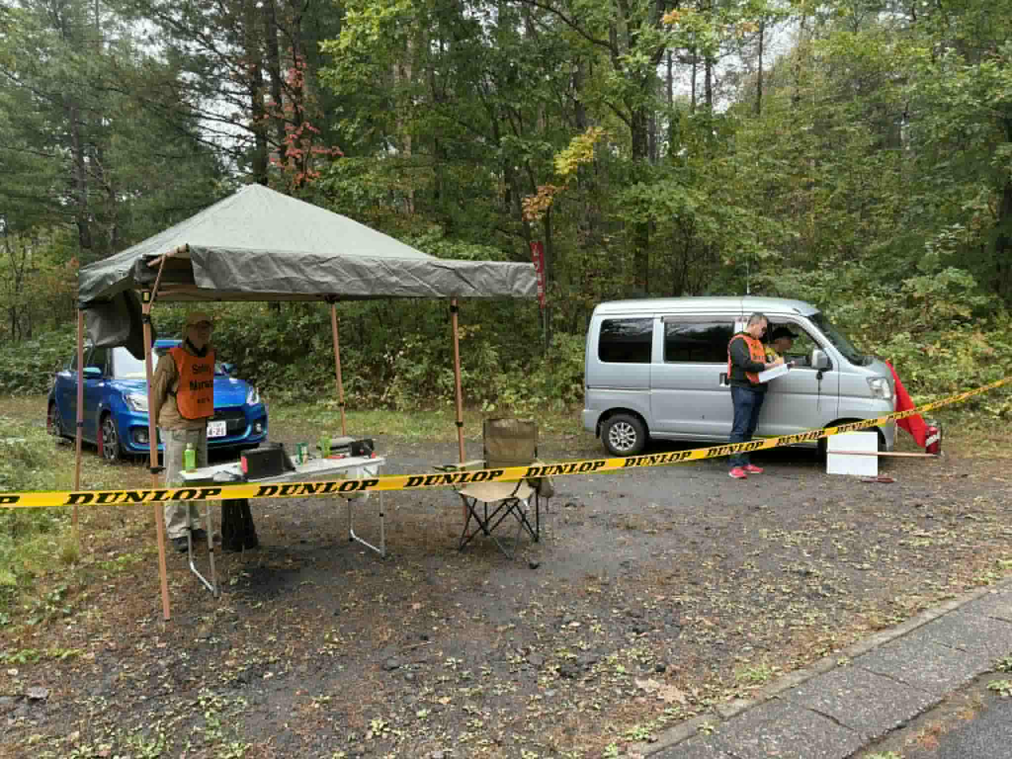 当日は昼頃から雨が心配されましたが、1本目、2本目ともに少し湿気たドライのコンディションで、無事全車計測&審査が終了できました。なお、計測箇所の封鎖ポイントでは、ご近所の住民の方も視察にいらっしゃり、賑やかに計測・審査することが出来ました。ラリーに理解があり、応援もしていただける地元住民の方・・ほんとにありがたいことです。