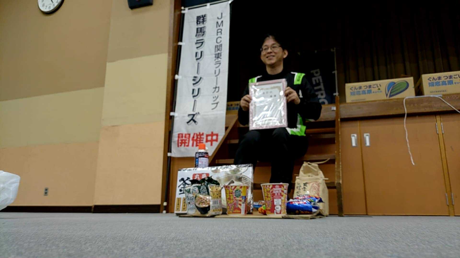 もはや定番となっているTR-8賞 1クラスは宇野選手(写真は代理の絶対王者の君じゃない方(^^; 村里さん) 最終戦八子ケ峰ラリーのキャッシュバック券です。いくらキャッシュバックされるのかはよー知らんけど・・(^^;