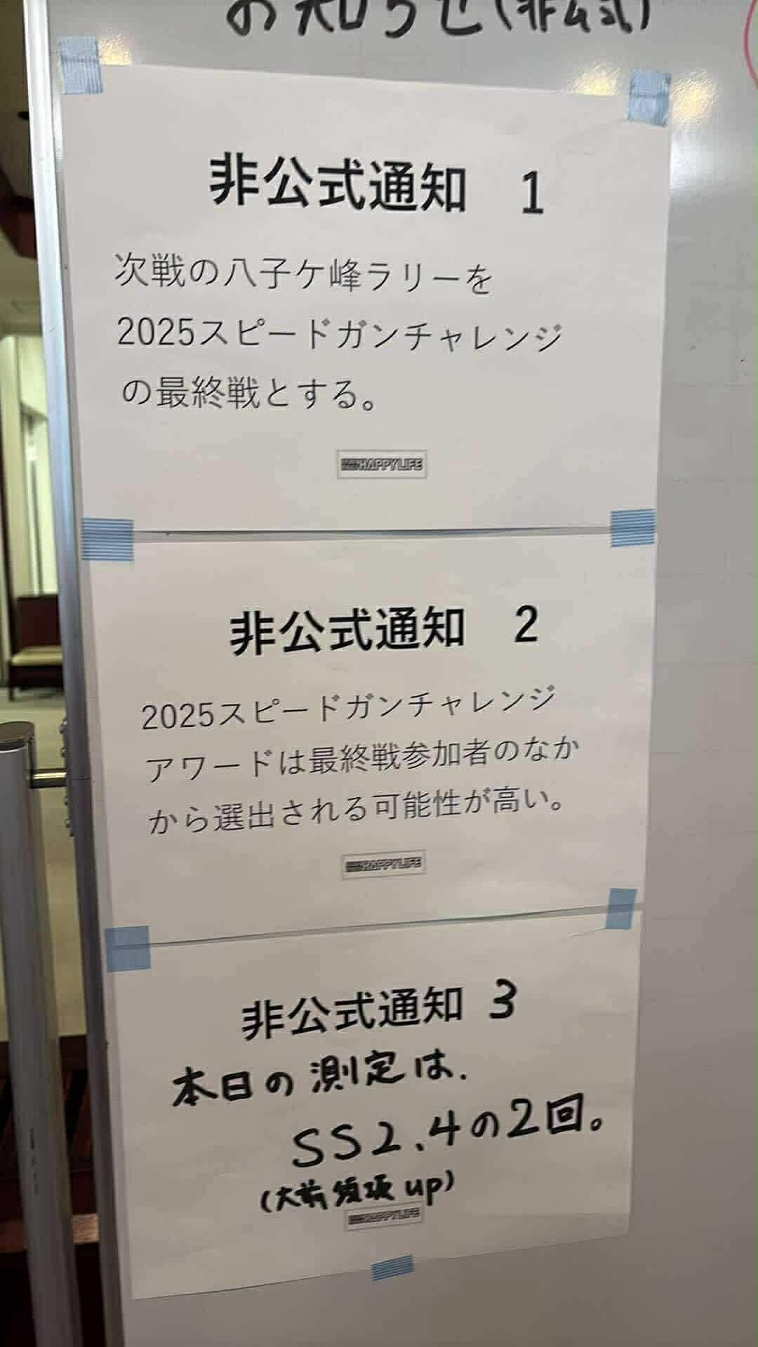 本ちゃんのラリーでは事前に予定していた林道が工事で使えなくなるというハプニングはありましたが、スピードガンチャレンジは予定通り行います・・・ということで事前情報です。